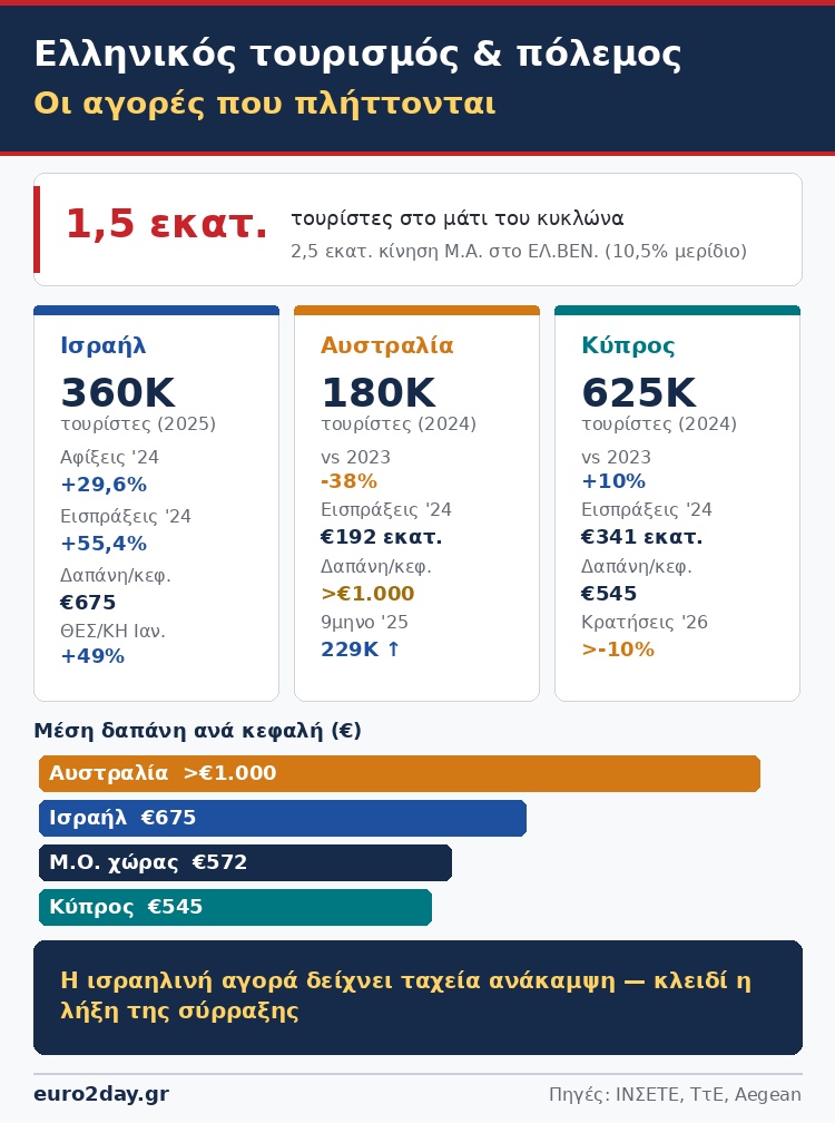 Από τη γεωπολιτική κρίση επηρεάζονται και οι Αυστραλοί, λόγω των ανταποκρίσεων σε αεροδρόμια των Ηνωμένων Αραβικών Εμιράτων. Οι τουρίστες που ταξίδεψαν στην Ελλάδα από την Αυστραλία το 2024 ανήλθαν σε 180 χιλιάδες, αριθμός μειωμένος κατά 38% σε σχέση με το 2023, με τις ταξιδιωτικές εισπράξεις να διαμορφώνονται σε 192 εκατ. ευρώ από 460 εκατ. το 2023.