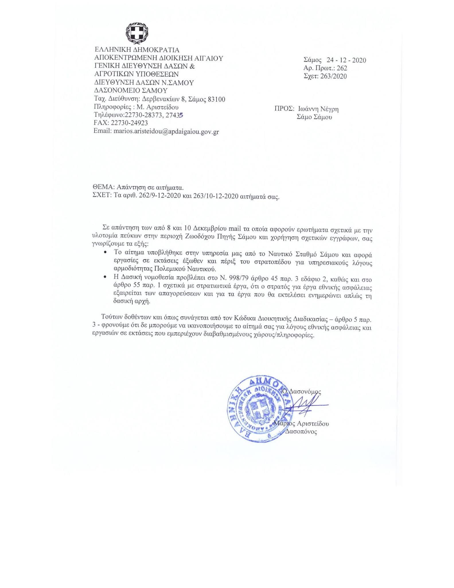 Αφήστε λοιπόν κύριε Αριστείδου τις <<αστήριχτες και αίολες νομικά>> τα περί εθνικής ασφάλειας απόψεις σας για να δικαιολογήσετε την παράνομη υλοτόμηση και το περιβαλλοντικό έγκλημα που συνετελέσατε στον περιβάλλοντα ιδιωτική έκταση του Μοναστηριού της Ζωοδόχου Πηγής και επειδή αυτά που σας λέμε και σας γράφουμε αφορούν απόφαση της αρχ'ης προστασίας προσωπικών δεδομένων σας ρωτάμε ποιος έκοψε τα πεύκα και με τι αντίτιμο;